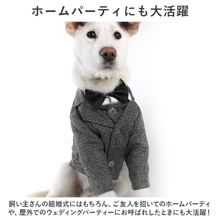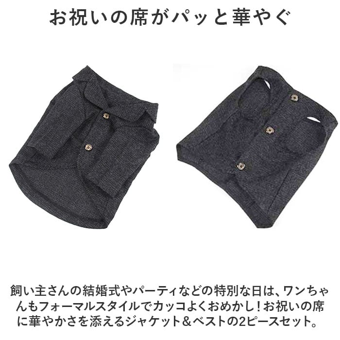・飼い主さんの結婚式やパーティなどの特別な日は、ワンちゃんもフォーマルスタイルでカッコよくおめかし!お祝いの席に華やかさを添えるジャケット&ベストの2ピースセット。