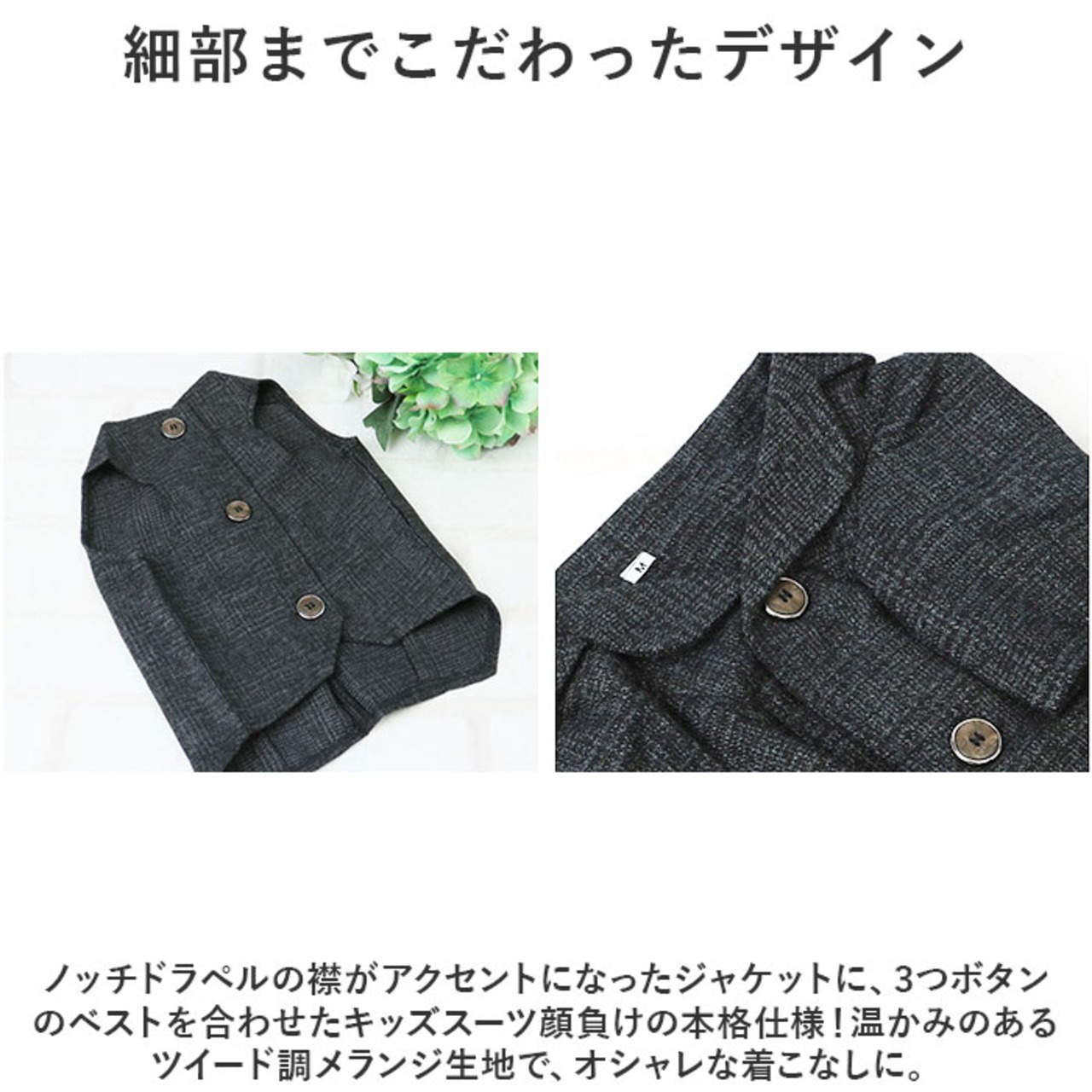 ・ノッチドラペルの襟がアクセントになったジャケットに、3つボタンのベストを合わせたキッズスーツ顔負けの本格仕様!温かみのあるツイード調メランジ生地で、オシャレな着こなしに。