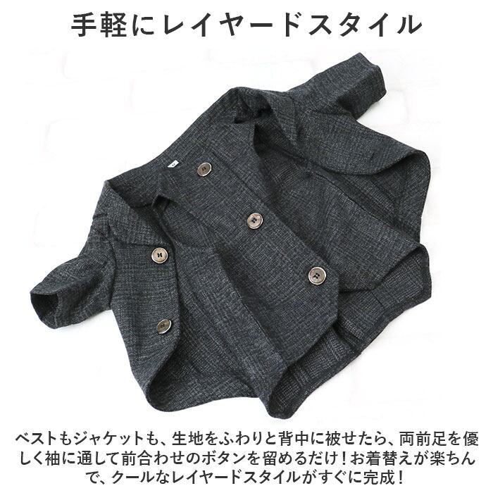 ・ベストもジャケットも、生地をふわりと背中に被せたら、両前足を優しく袖に通して前合わせのボタンを留めるだけ!お着替えが楽ちんで、クールなレイヤードスタイルがすぐに完成!