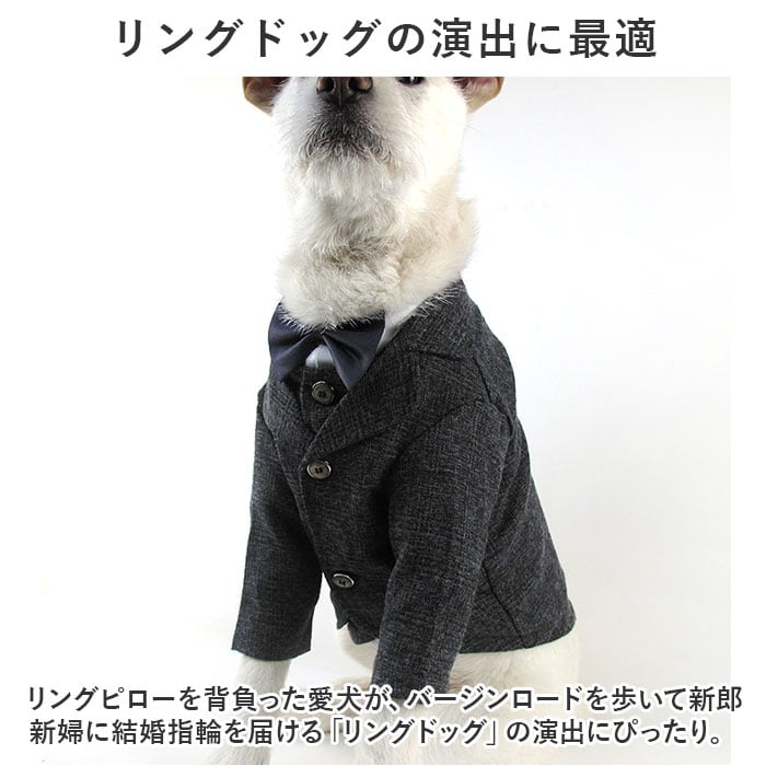 ・ジャケット胸元のVゾーンから蝶ネクタイを覗かせれば、可愛らしい小さな紳士に変身!飼い主さんのタキシードやスーツに合わせてリンクコーデも自在。(※本商品に蝶ネクタイは付属しておりません。)