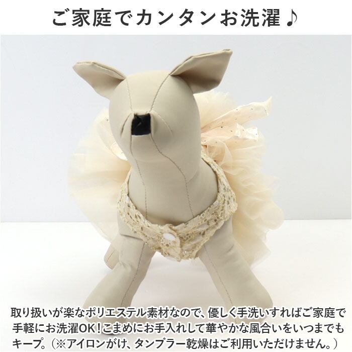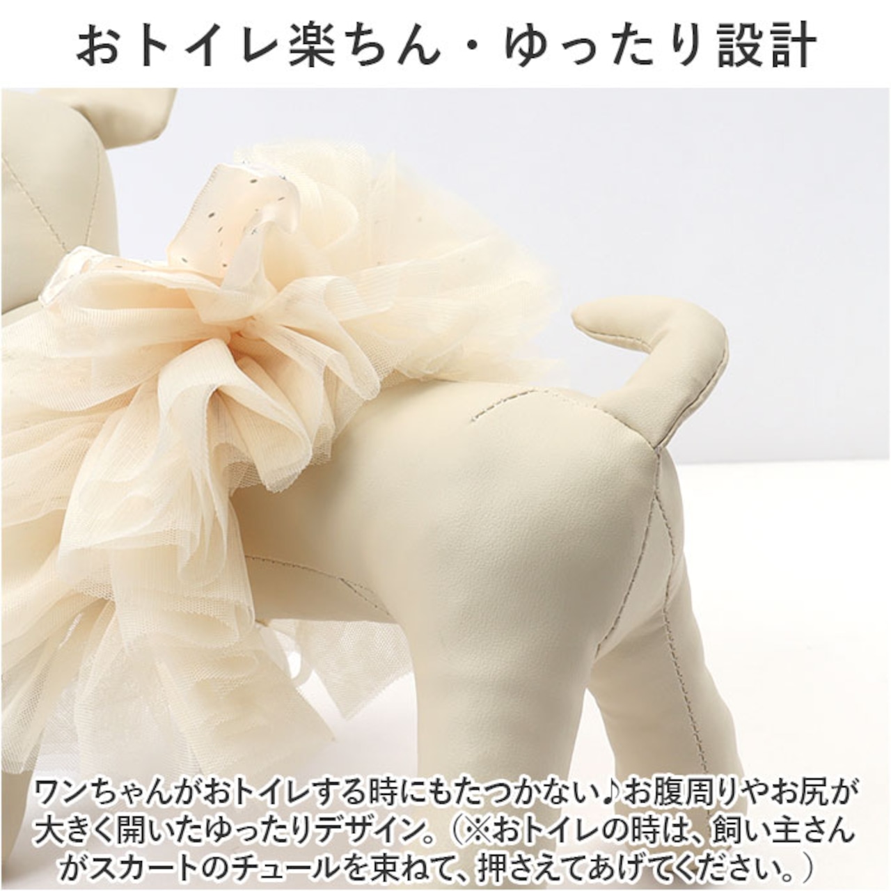 ・ワンちゃんがおトイレする時にもたつかない♪お腹周りやお尻が大きく開いたゆったりデザイン。(※おトイレの時は、飼い主さんがスカートのチュールを束ねて、押さえてあげてください。)