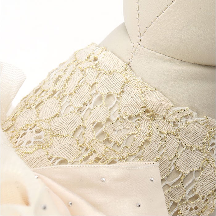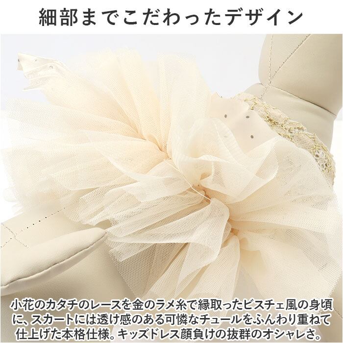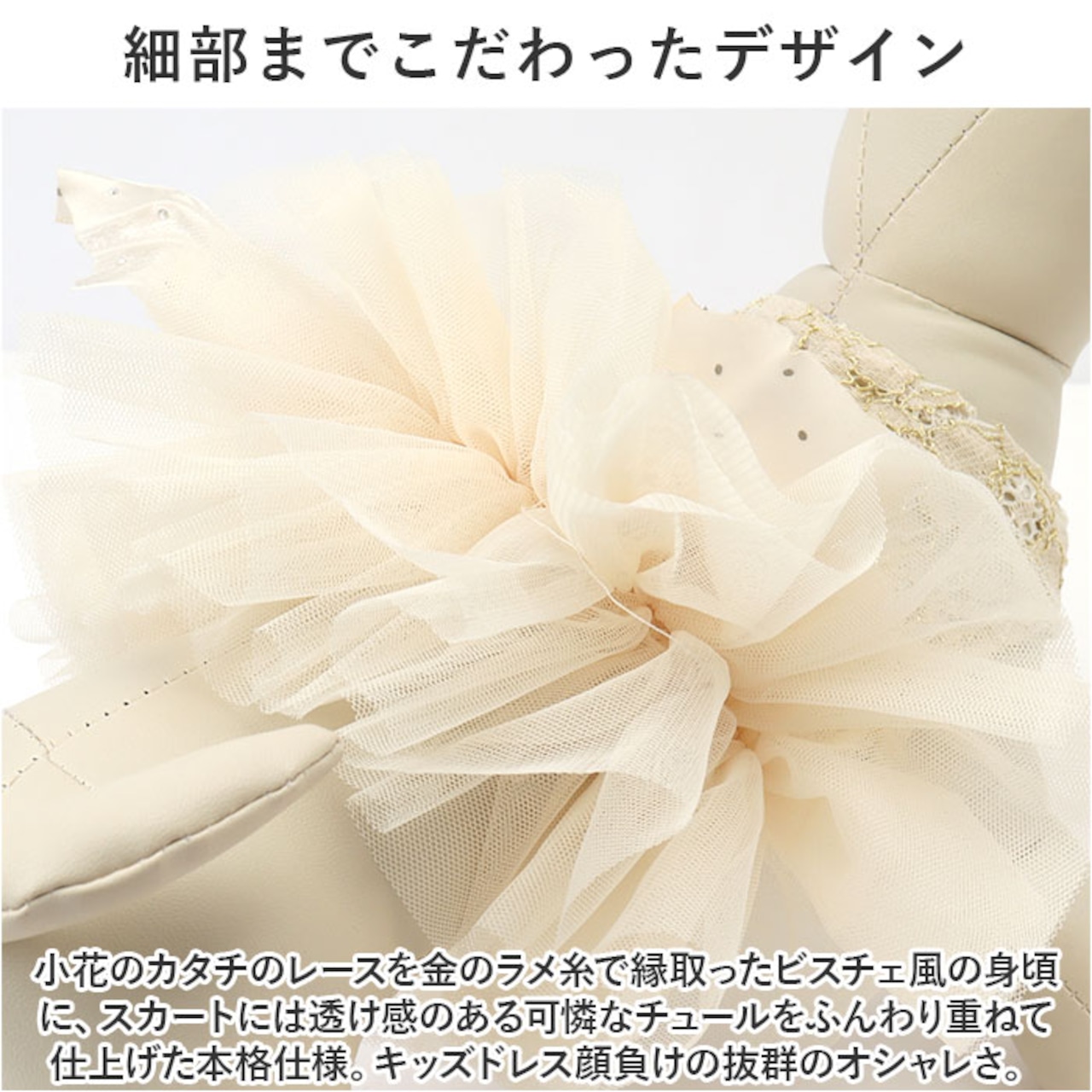 ・小花のカタチのレースを金のラメ糸で縁取ったビスチェ風の身頃に、スカートには透け感のある可憐なチュールをふんわり重ねて仕上げた本格仕様。キッズドレス顔負けの抜群のオシャレさ。