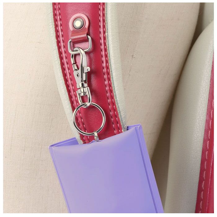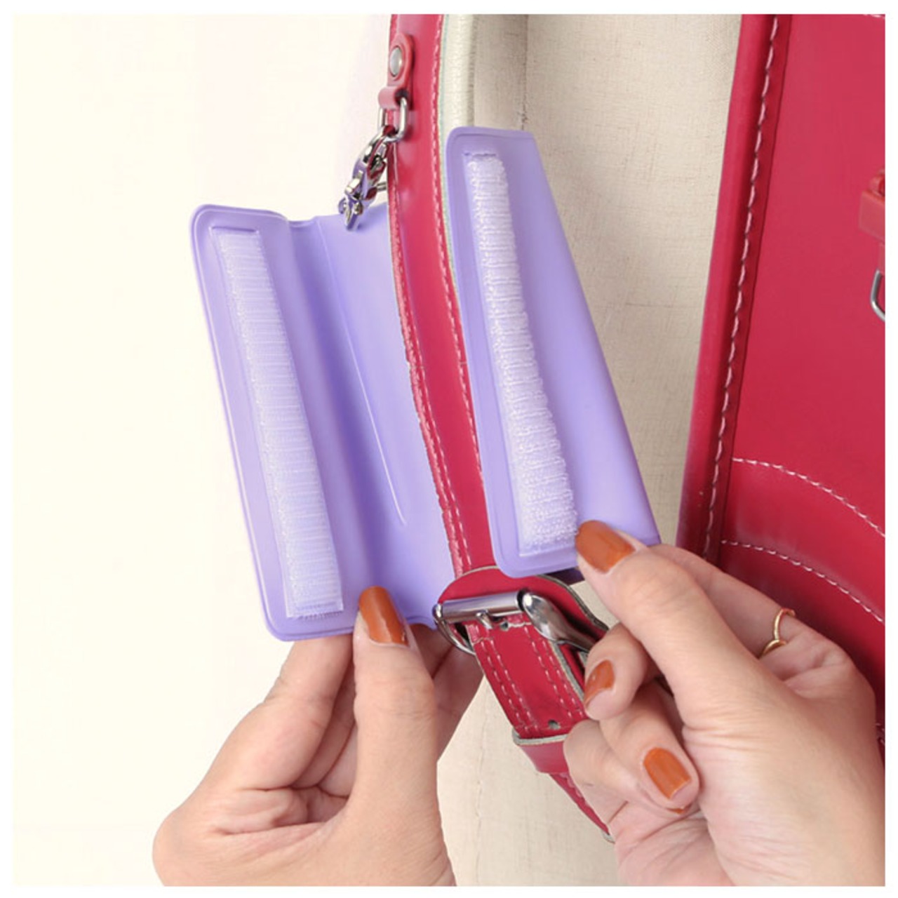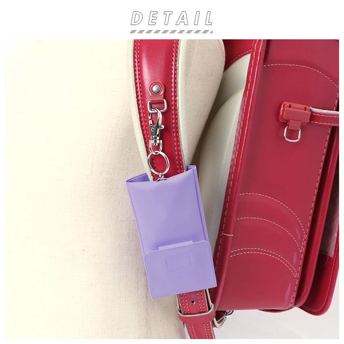 ・ランドセルの肩ベルトに本体を巻きつける様に留め、フックをランドセルのDカンに装着するからお子様が走り回っても落ちにくい。