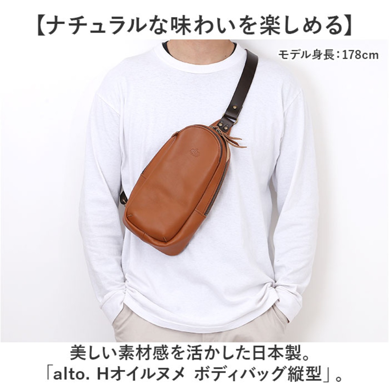 ・美しい素材感を活かした日本製。「alto. Hオイルヌメ ボディバッグ縦型」。