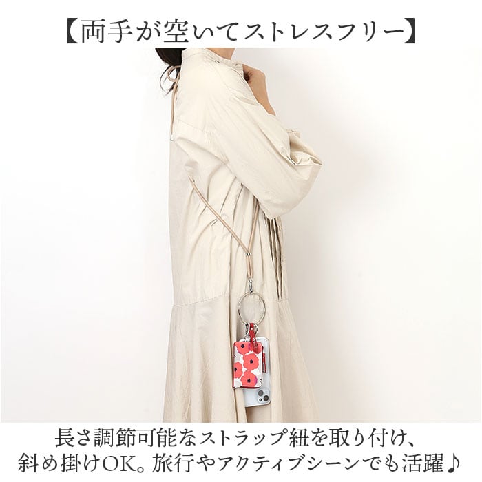 ・スマホを取り付けできるストラップ。小物が入るポーチ付きで、最低限のアイテムがすっきり。