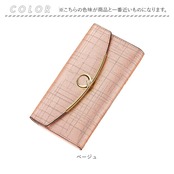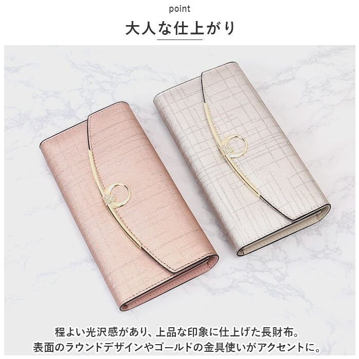 ・程よい光沢感があり、上品な印象に仕上げた長財布。表面のラウンドデザインやゴールドの金具使いがアクセントに。