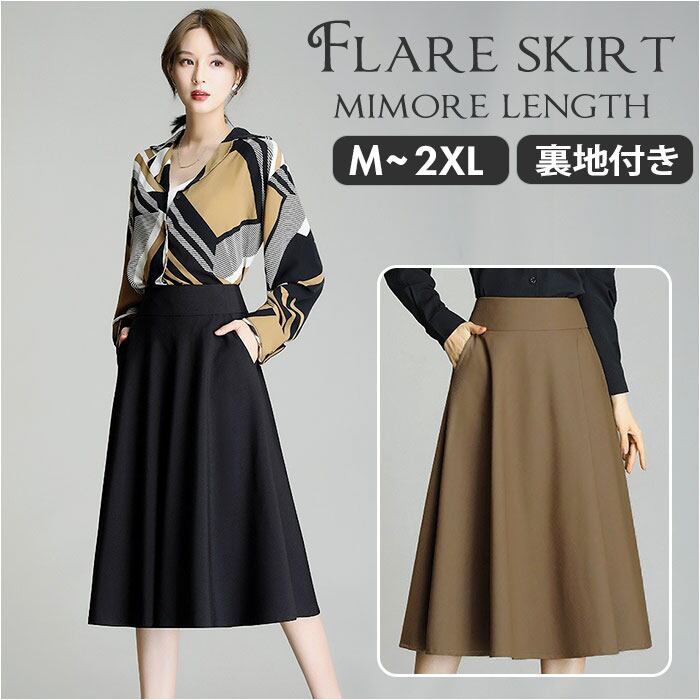フレアスカート ミモレ丈 通販 ロング スカート ロングスカート フレア Aライン ハイウエスト ゴム 膝下 ひざ下 上品 大きいサイズ 無地 カジュアル フォーマル 二次会 オフィス
