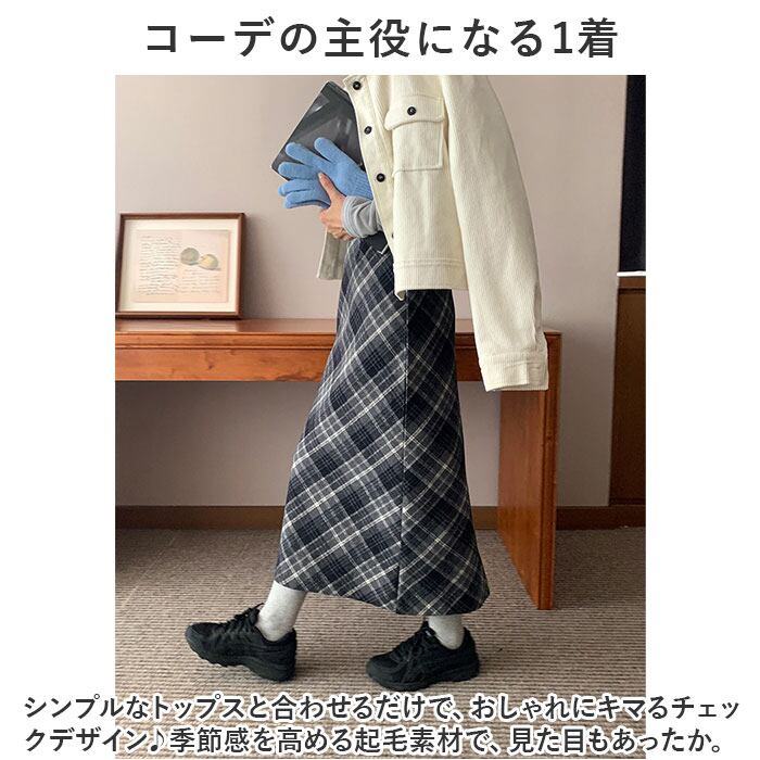 ・シンプルなトップスと合わせるだけで、おしゃれにキマるチェックデザイン♪季節感を高める起毛素材で、見た目もあったか。