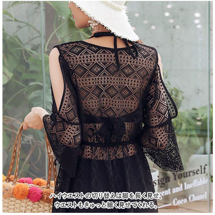 ・総レースのワンピースを纏えば、大きく開いた胸元と透けた肌がセクシー。ハイウエストの切り替えは脚を長く見せ、ウエストもきゅっと細く見せてくれる。さらに、気になるお腹~お尻、太ももをカバーしてくれる♪