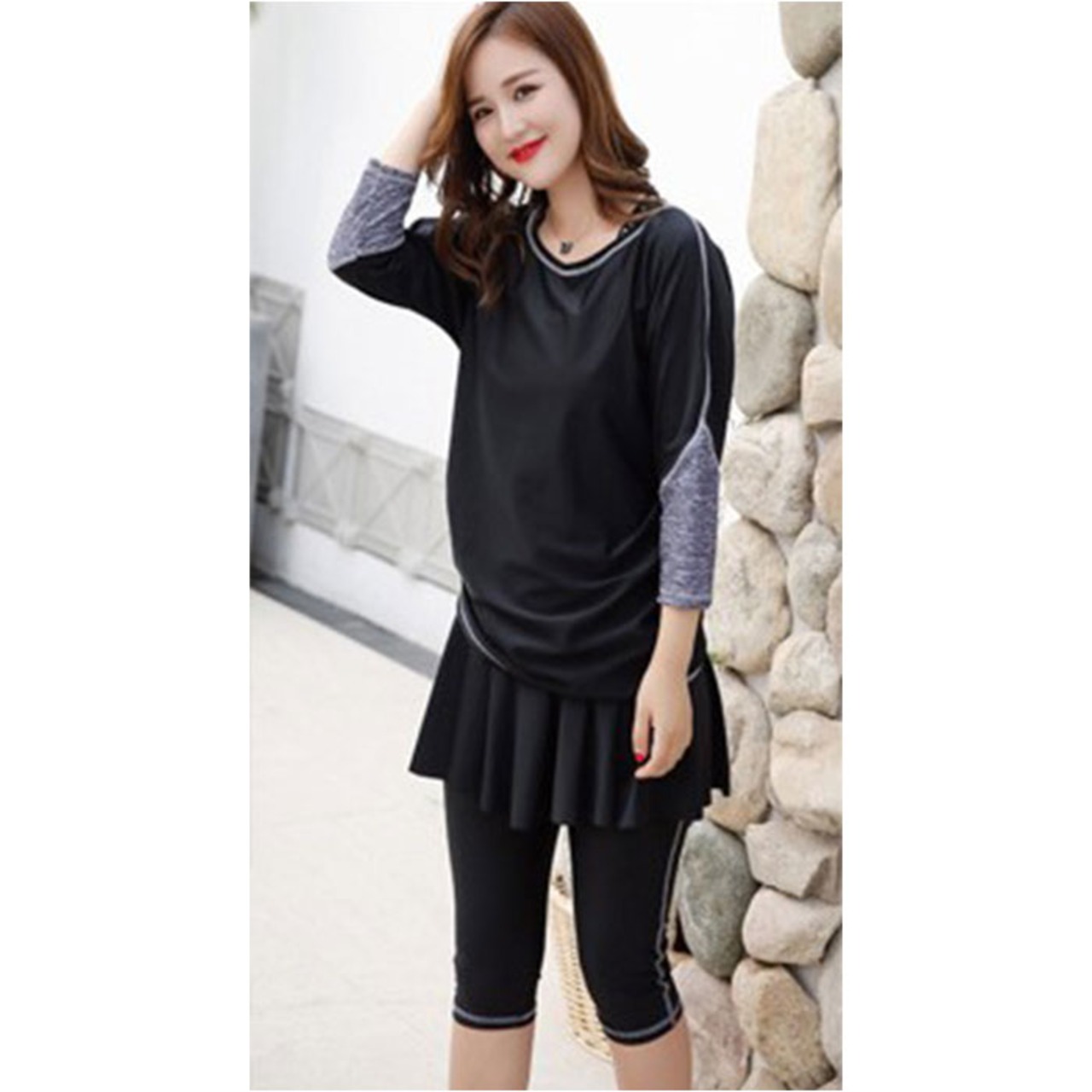 ・ほどよい丈感の上下セット。露出を控えたスポーティなデザインなので、フィットネスもOK!