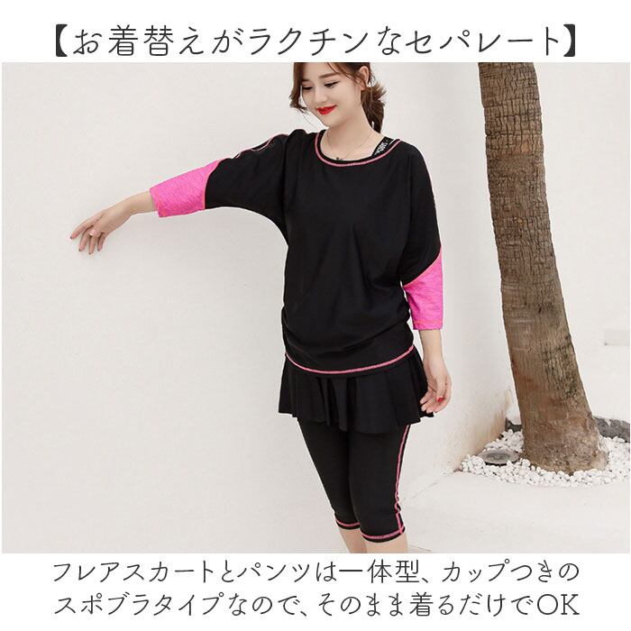 ・フレアスカートとパンツは一体型、カップつきのスポブラタイプなので、そのまま着るだけでOK