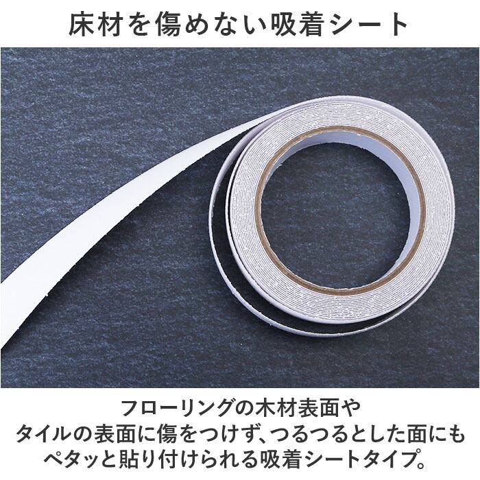 ・フローリングの木材表面やタイルの表面に傷をつけず、つるつるとした面にもペタッと貼り付けられる吸着シートタイプ。