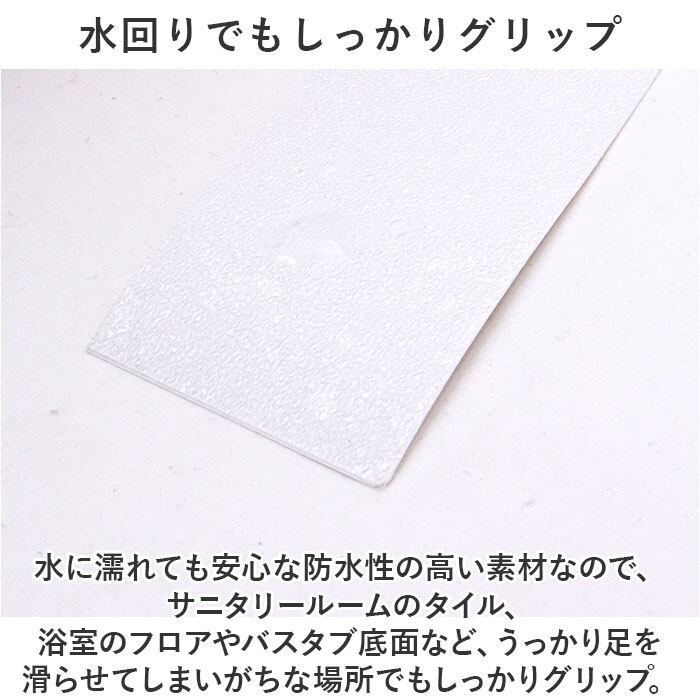 ・水に濡れても安心な防水性の高い素材なので、サニタリールームのタイル、浴室のフロアやバスタブ底面など、うっかり足を滑らせてしまいがちな場所でもしっかりグリップ。