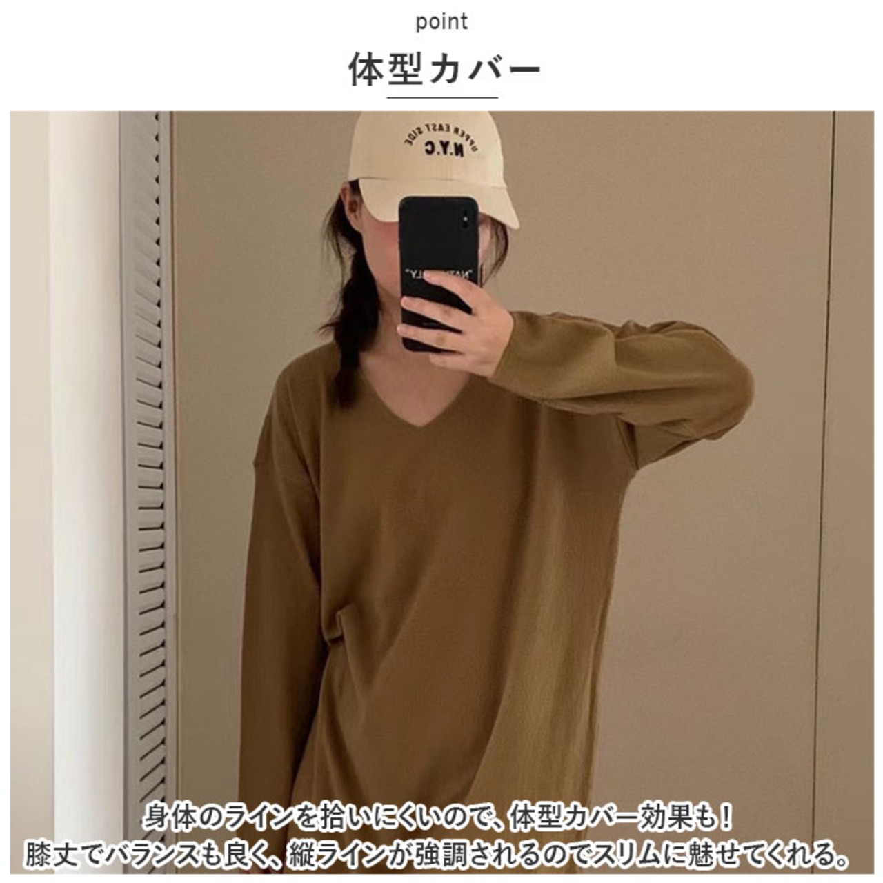 ・身体のラインを拾いにくいので、体型カバー効果も!膝丈でバランスも良く、縦ラインが強調されるのでスリムに魅せてくれる。