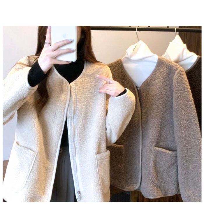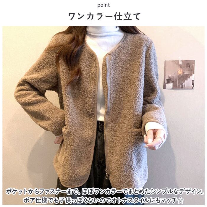 ボア ジャケット レディース 通販 ノーカラー アウター コート ブルゾン おしゃれ 大人 ショート丈 ファスナー フロントジッパー もこもこ ふわふわ 暖かい あったか 秋 冬 きれいめ オフィス かわいい 可愛い 防寒 ポケット 上品 カジュアル シンプル