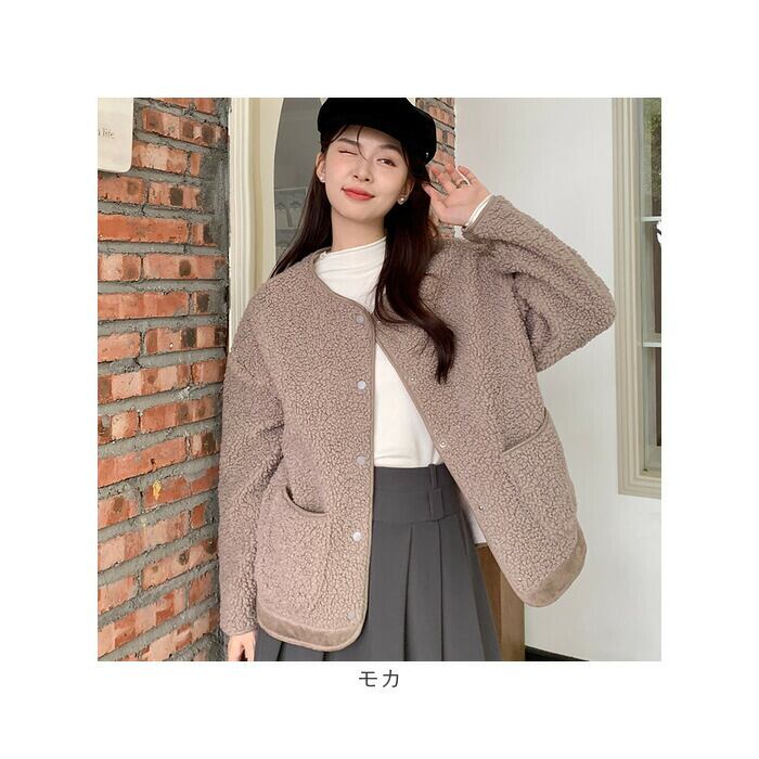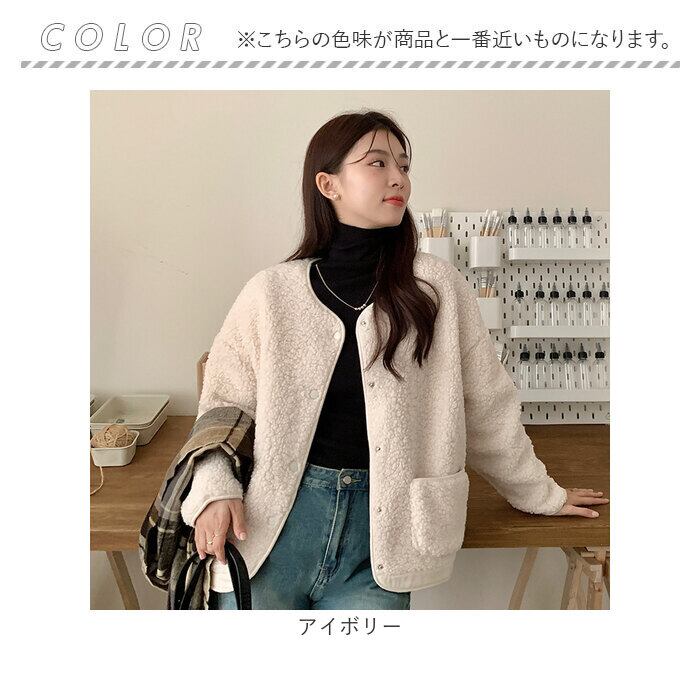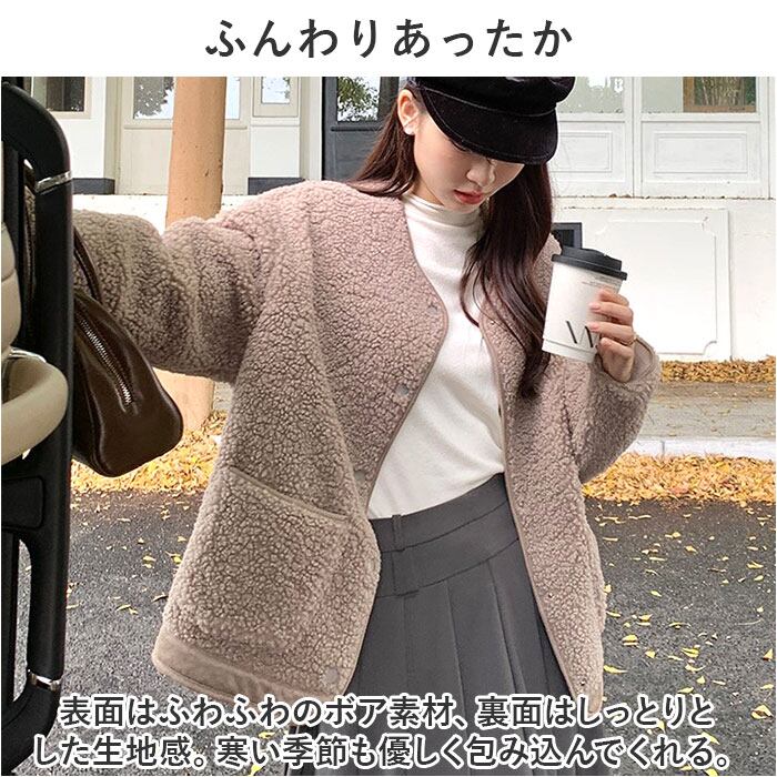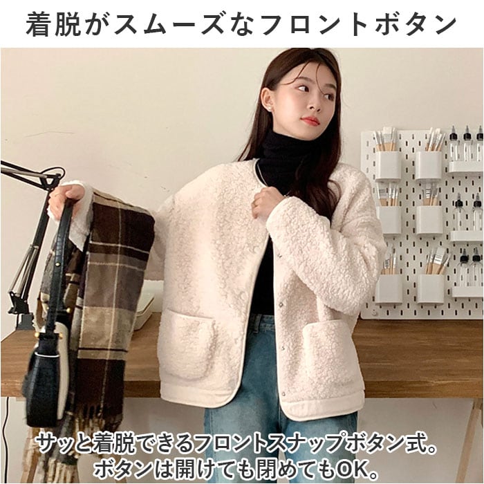ボア ジャケット レディース 通販 ノーカラー アウター コート ブルゾン おしゃれ 大人 ショート丈 もこもこ ふわふわ ゆったり 暖かい あったか 秋 冬 きれいめ オフィス かわいい 可愛い ポケット 防寒 スタイリッシュ 通勤 カジュアル シンプル