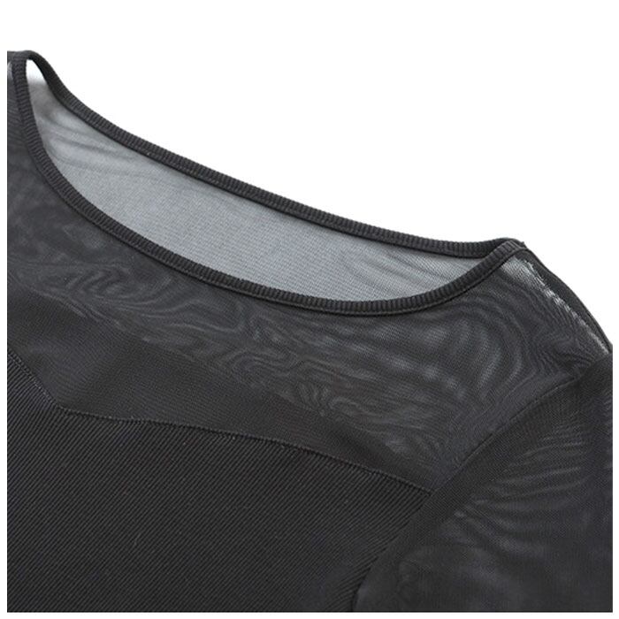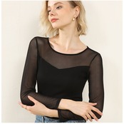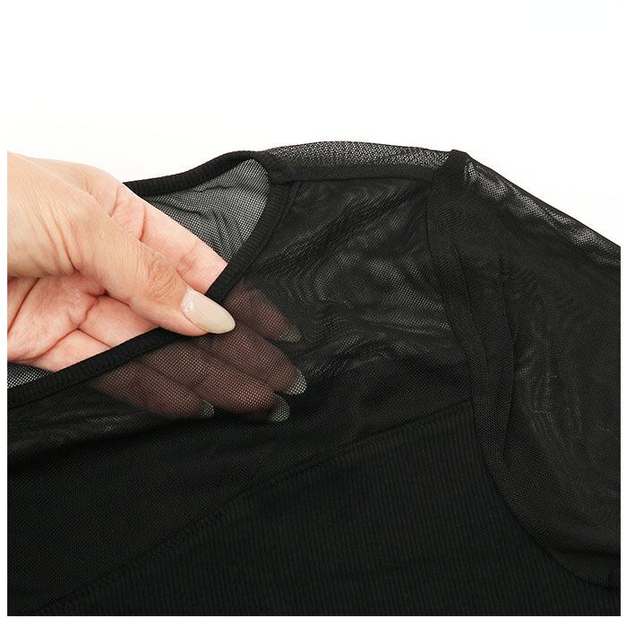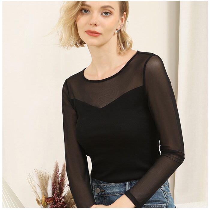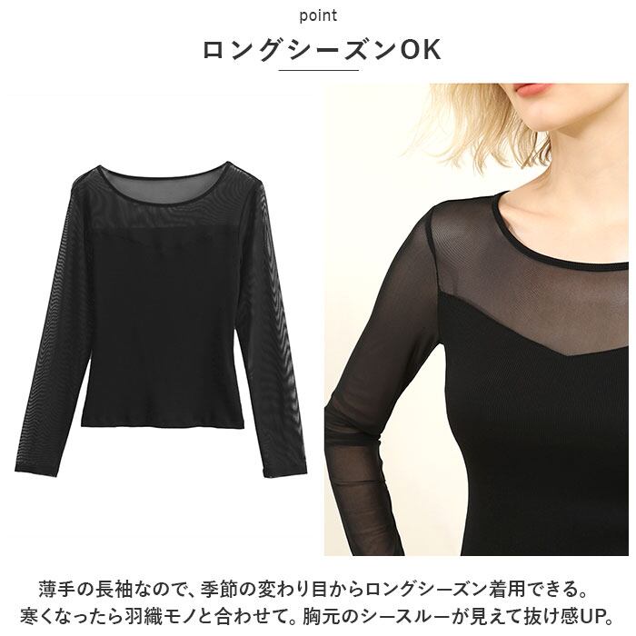 ・薄手の長袖なので、季節の変わり目からロングシーズン着用できる。寒くなったら羽織モノと合わせて。胸元のシースルーが見えて抜け感UP。