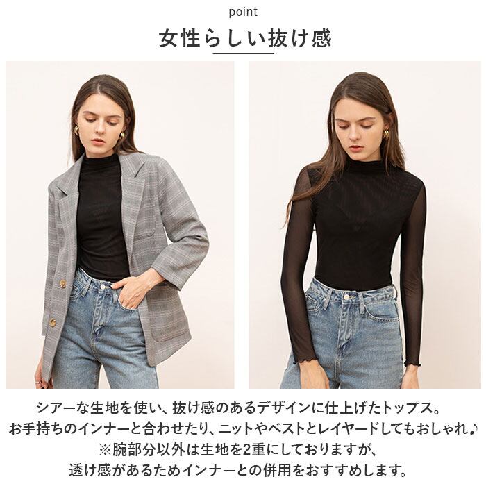 ・シアーな生地を使い、抜け感のあるデザインに仕上げたトップス。お手持ちのインナーと合わせたり、ニットやベストとレイヤードしてもおしゃれ♪(※腕部分以外は生地を2重にしておりますが、透け感があるためインナーとの併用をおすすめします。)