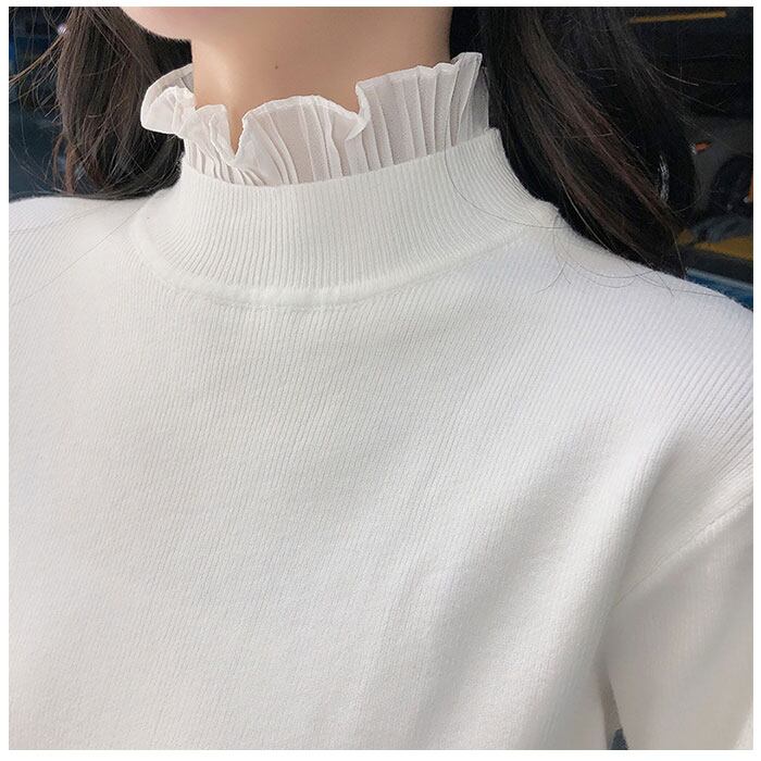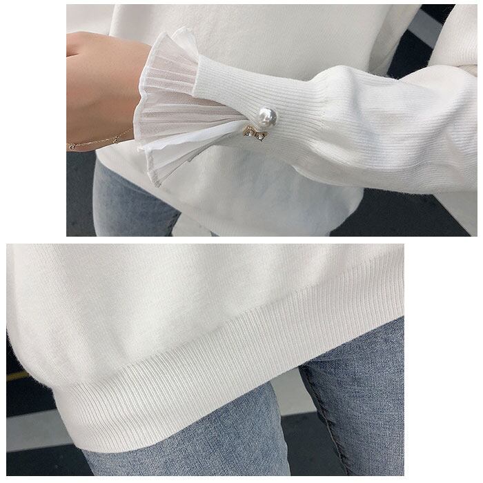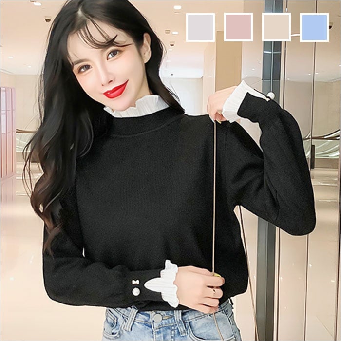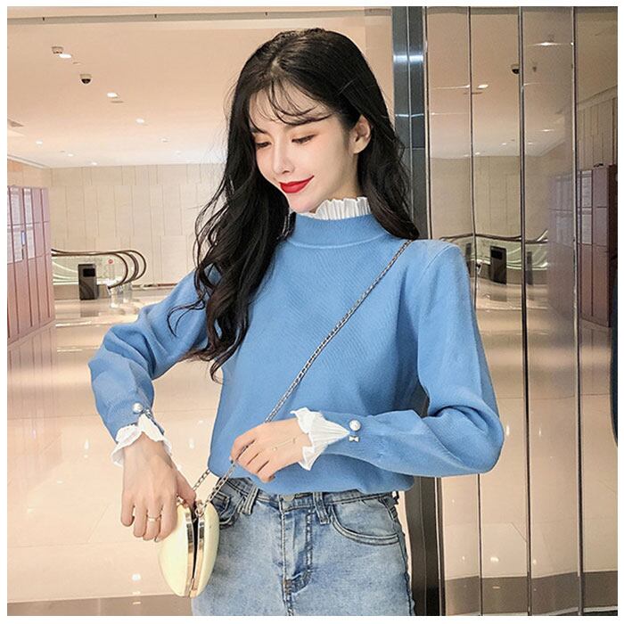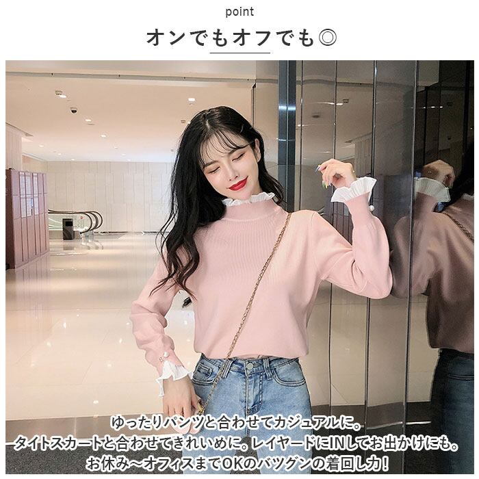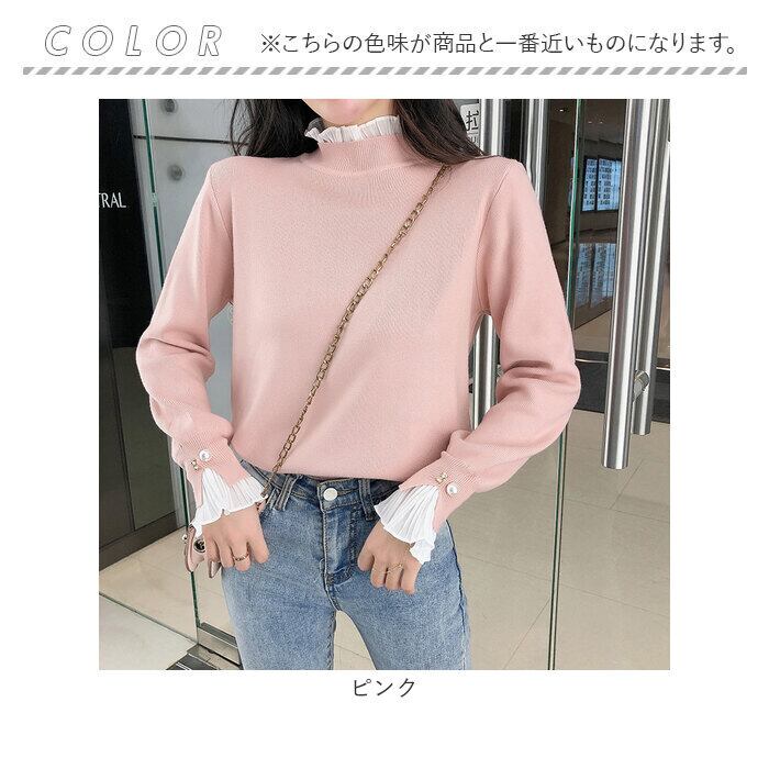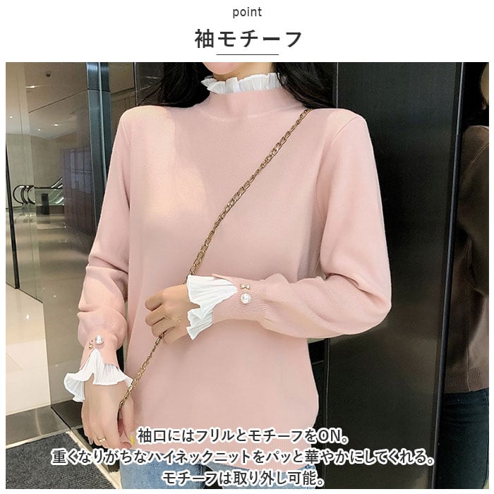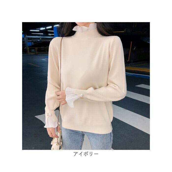 薄い ニット レディース 通販 セーター ハイネック 秋冬 秋 冬 薄手 長袖 フリル 襟 フリル袖 ビジュー スタンドカラー 立ち襟 おしゃれ シンプル きれいめ 上品 大人 かわいい カジュアル オフィスカジュアル 無地 トップス レディースファッション