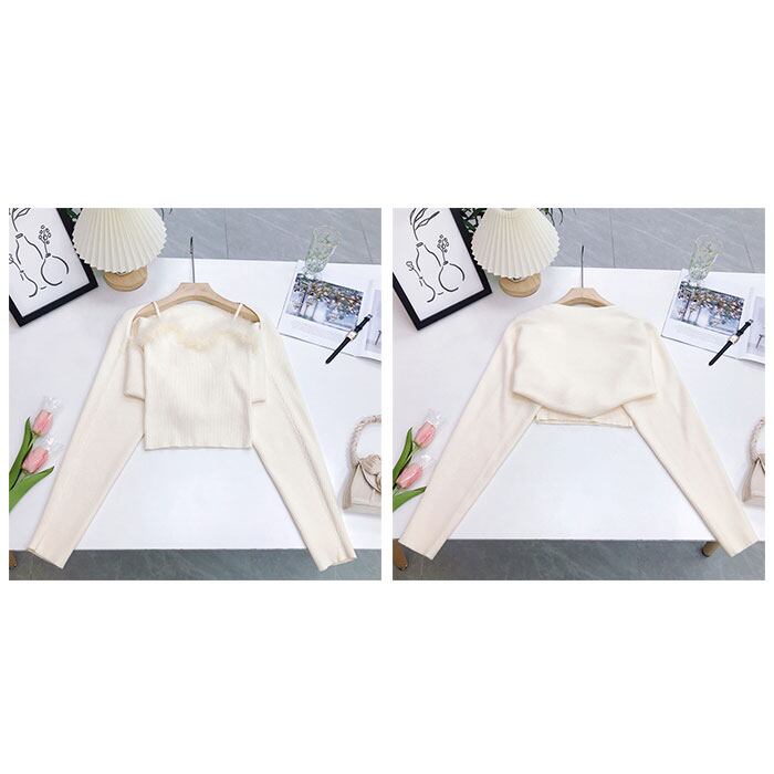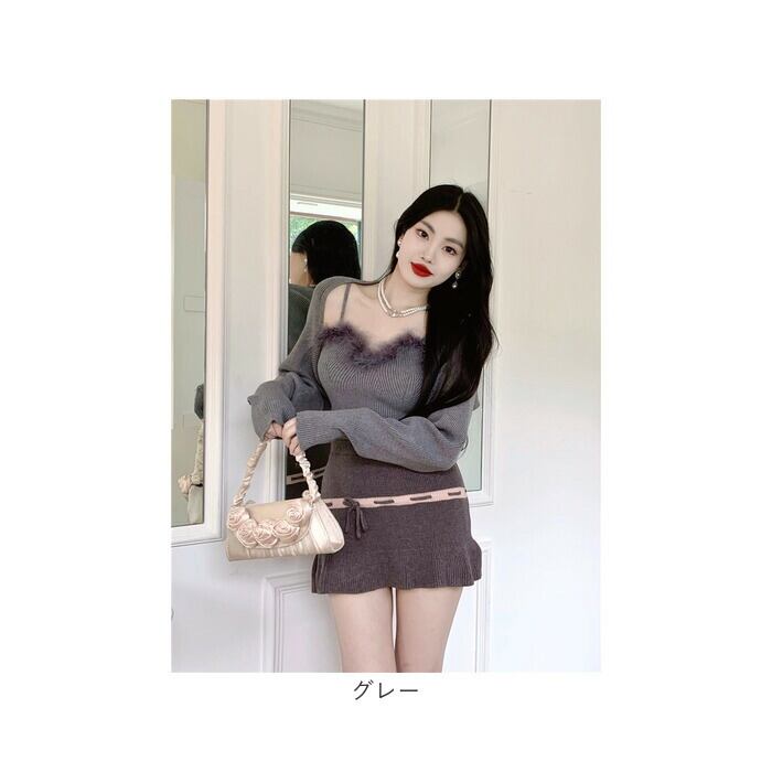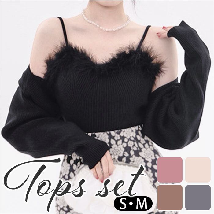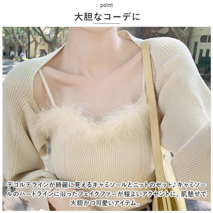 ・デコルテラインが綺麗に見えるキャミソールとニットのセット♪キャミソールのハートラインに沿ったフェイクファーが程よいアクセントに。肌魅せで大胆かつ可愛いアイテム。