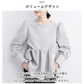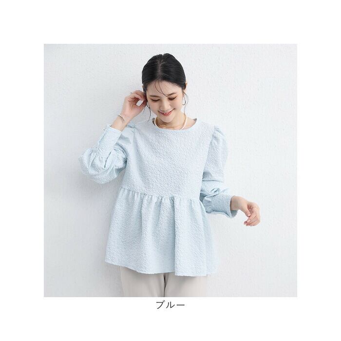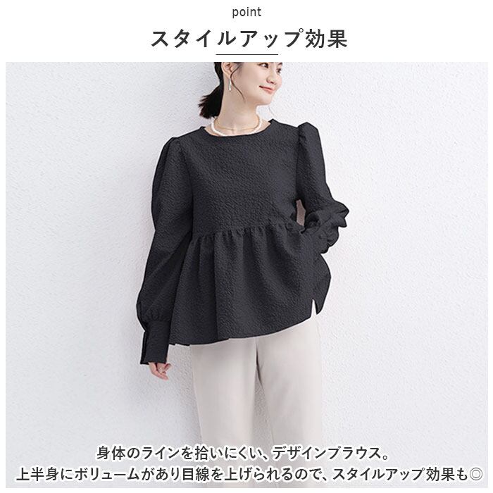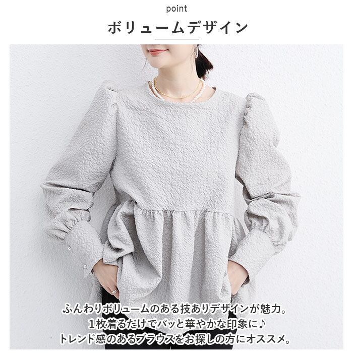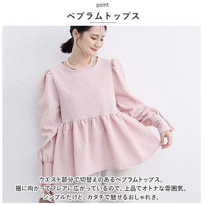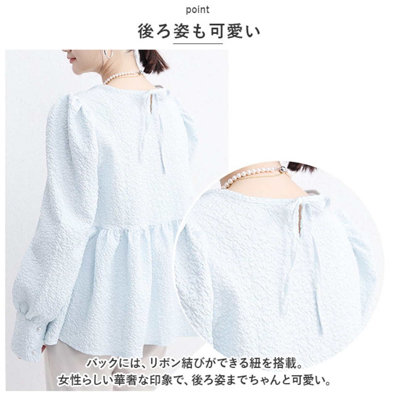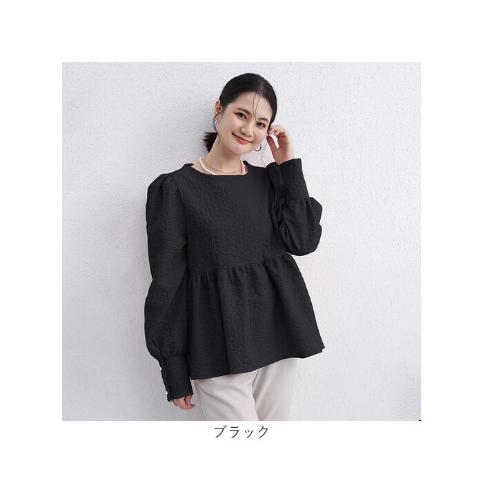 ブラウス レディース おしゃれ 通販 カットソー ペプラム トップス フレア 長袖 プルオーバー パフスリーブ ボリュームスリーブ 袖コンシャス 大人 かわいい エンボス きれいめ 上品 きちんと 入園式 卒園式 入学式 卒業式 無地 レディースファッション