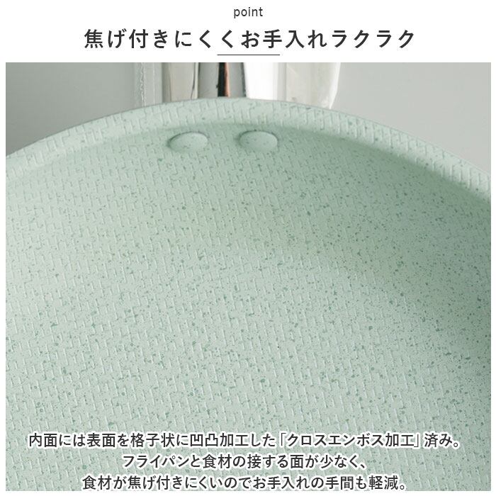 ・内面には表面を格子状に凹凸加工した「クロスエンボス加工」済み。フライパンと食材の接する面が少なく、食材が焦げ付きにくいのでお手入れの手間も軽減。