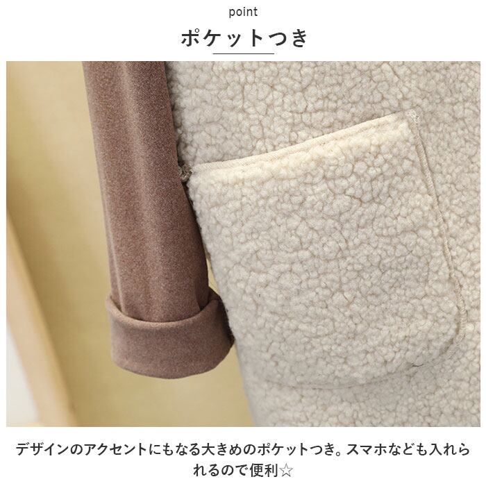 ・外側はもこもこのボア仕様♪見た目も暖かく秋冬コーデにピッタリ!裏地はスエード調の生地を使用しチクチクしにくく、快適な着心地。