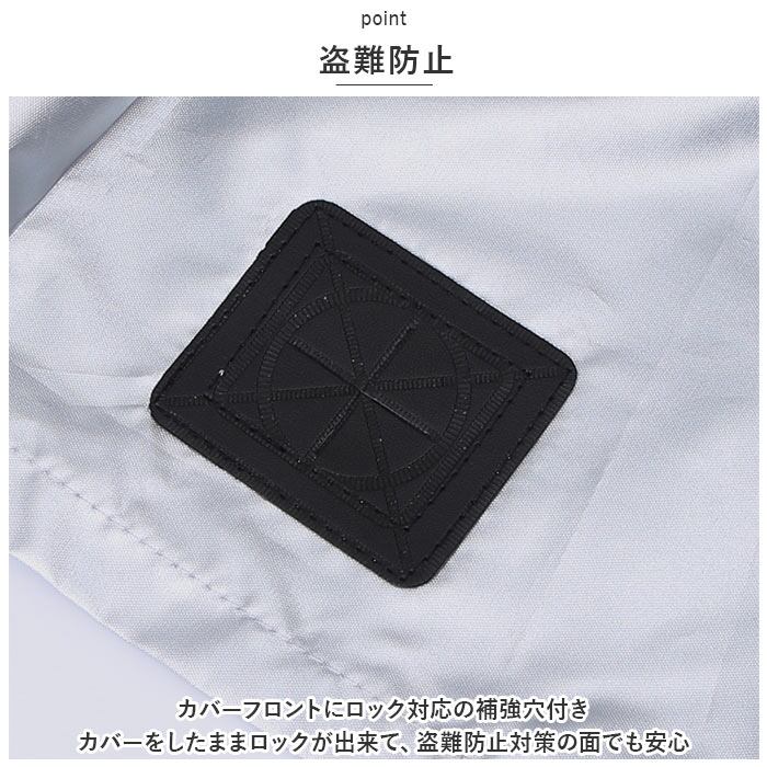 ・カバーフロントにロック対応の補強穴付き。カバーをしたままロックが出来て、盗難防止対策の面でも安心。