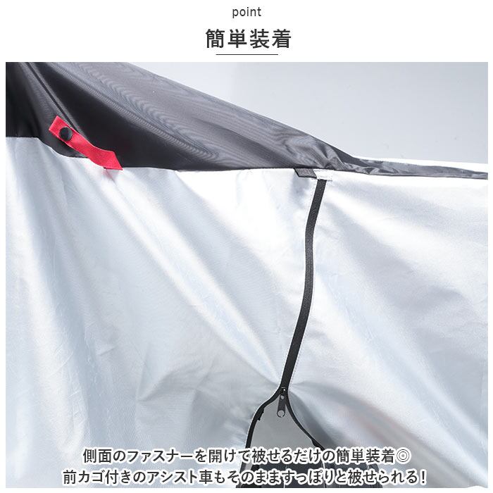 ・側面のファスナーを開けて被せるだけの簡単装着◎前カゴ付きのアシスト車もそのまますっぽりと被せられる!