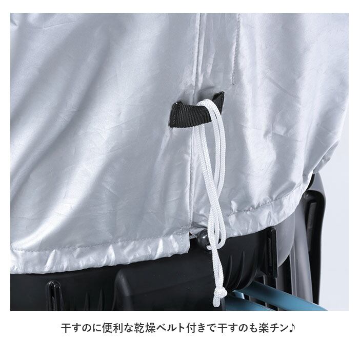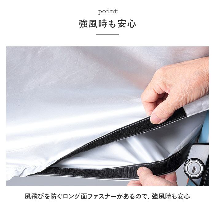 ・ロングタイプは長さ176cmとなり、通常タイプより15cm長さがUP!リアチャイルドシート付き電動アシスト車・シティ車まで、幅広い自転車に対応。(※自転車のサイズ、形状によって被りこみ具合は異なります。)