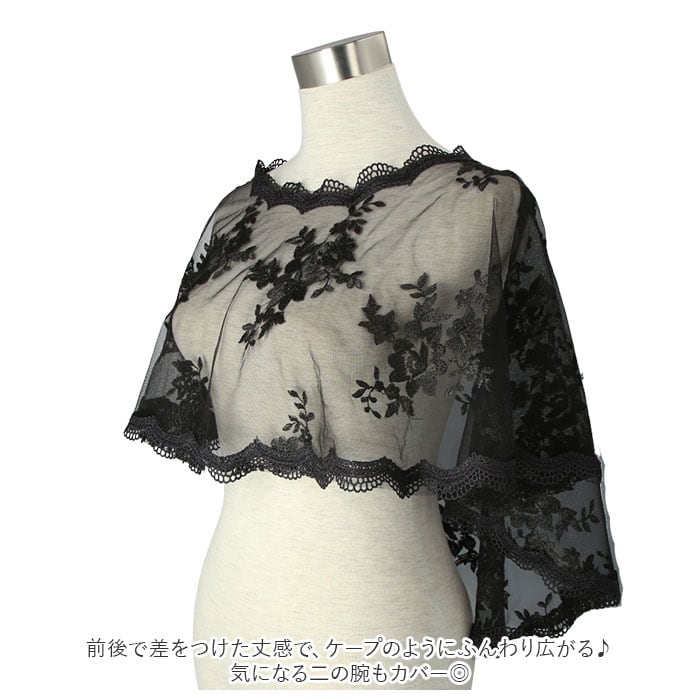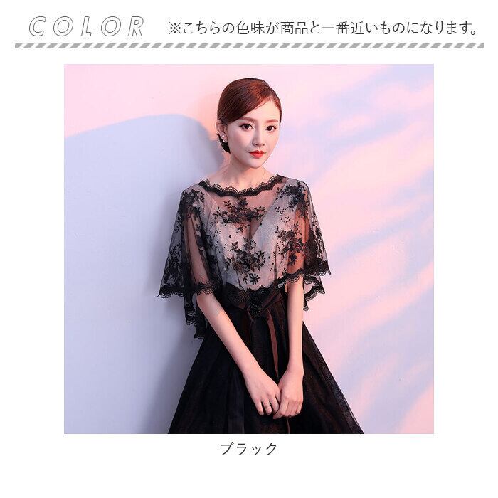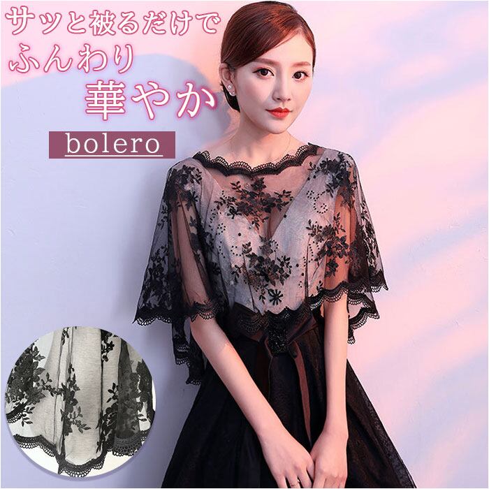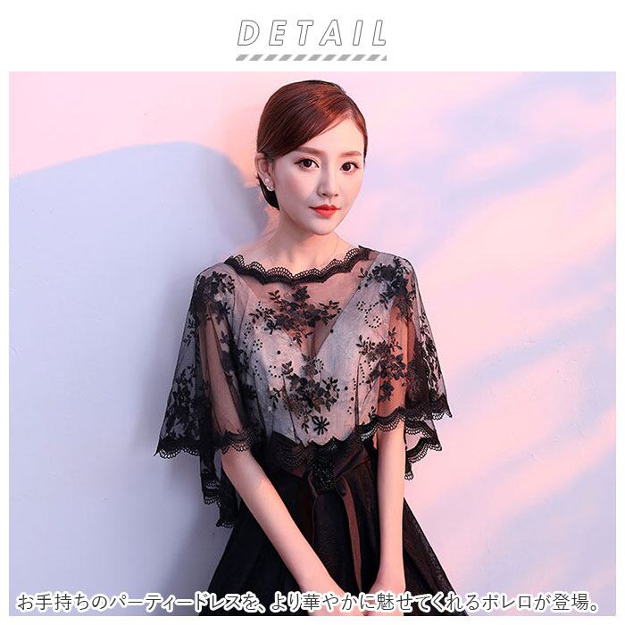結婚式 ショール ボレロ 通販 レース フォーマル ケープ風 かぶり 肩掛け パーティ 披露宴 二次会 パーティー 発表会 パーティードレス 刺繍 花 黒 ブラック スカラップ 春 夏 春夏 おしゃれ シンプル かわいい 可