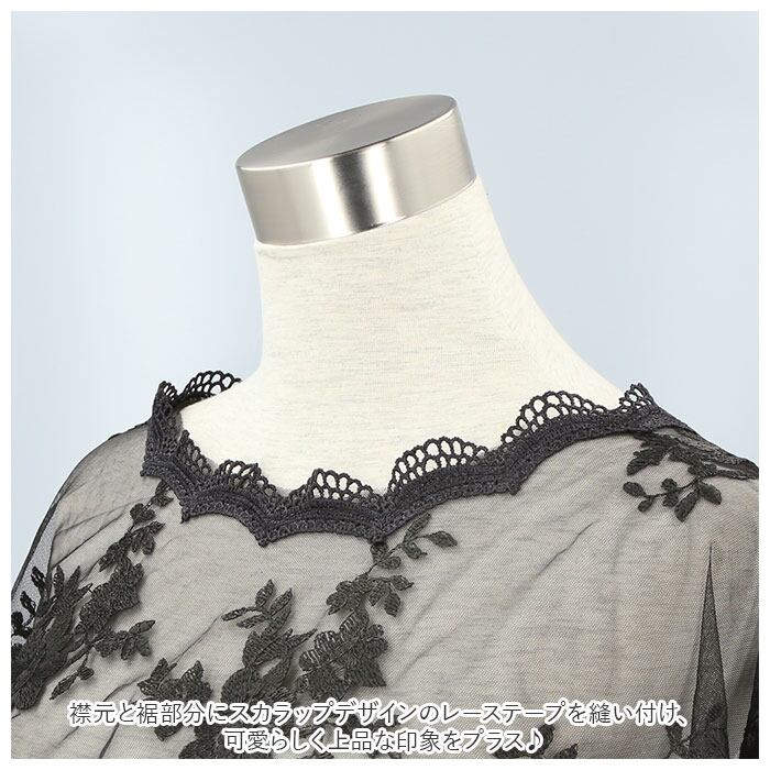 ・襟元と裾部分にスカラップデザインのレーステープを縫い付け、可愛らしく上品な印象をプラス♪