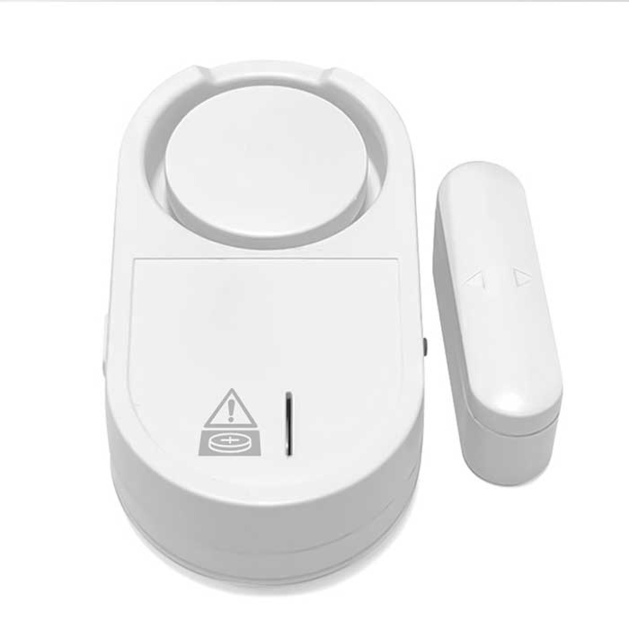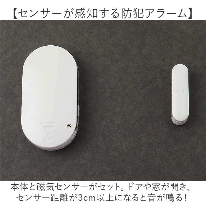 ・本体と磁気センサーがセット。ドアや窓が開き、センサー距離が3cm以上になると音が鳴る!