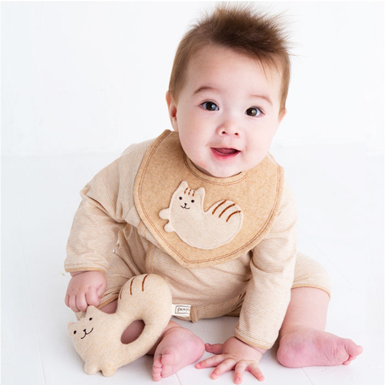 ・小さめサイズで、首まわりのサイズ調節が簡単な面ファスナー式。吸水性も肌触りもばっちり。