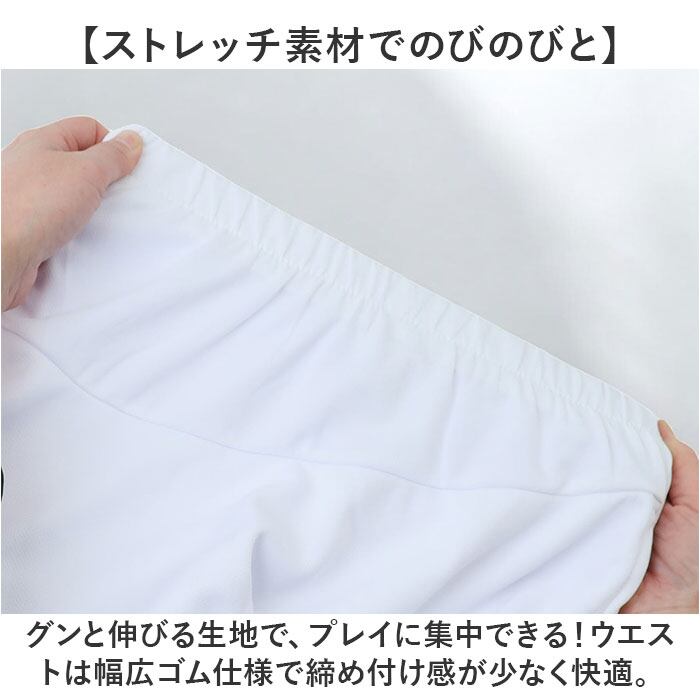 ・グンと伸びる生地で、プレイに集中できる!ウエストは幅広ゴム仕様で締め付け感が少なく快適。