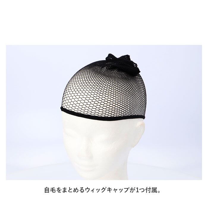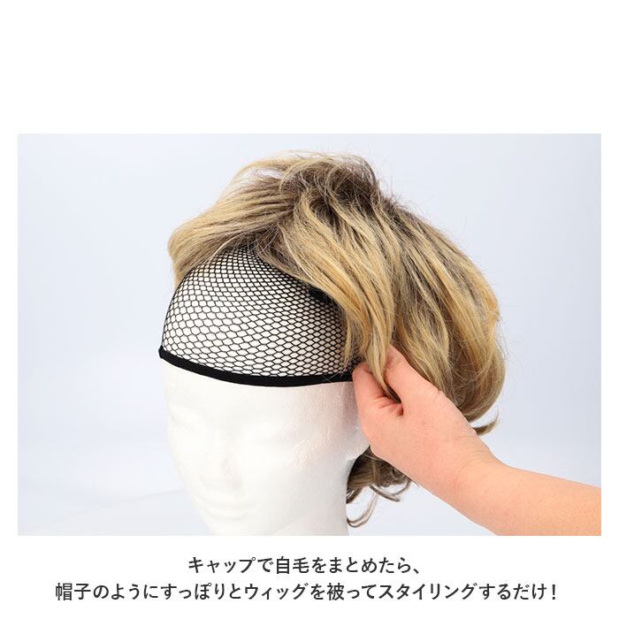 ・キャップで自毛をまとめたら、帽子のようにすっぽりとウィッグを被ってスタイリングするだけ!