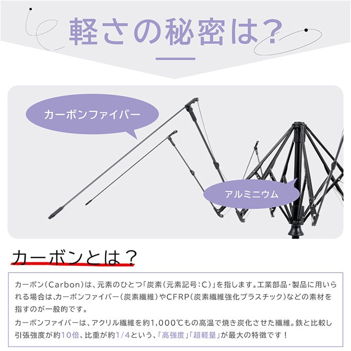 ・傘の骨組みにカーボンファイバーを使用することで、高強度・超軽量化をを実現!収納袋のボタンを留めればさらにコンパクト。