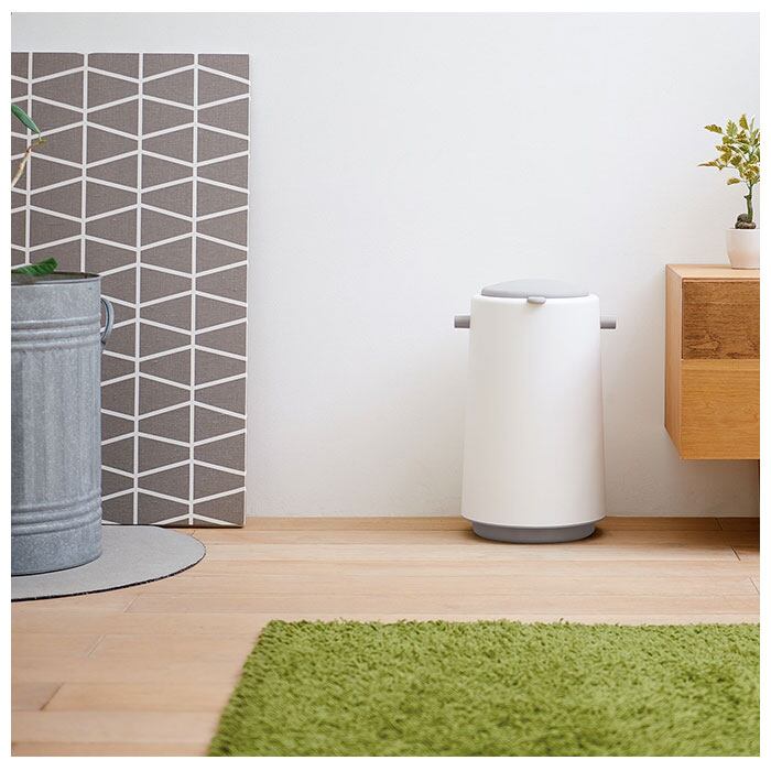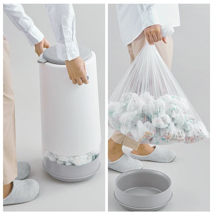 ・ゴミ捨て時には、本体側面の取っ手を持って持ち上げると、筒状の本体と底面が外れてゴミ袋が出てくる仕様。重たいゴミ袋を持ち上げる必要がなく、産後のママやご年配の方にとっても嬉しい!