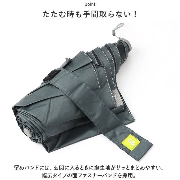 ・留めバンドには、玄関に入るときに傘生地がサッとまとめやすい、幅広タイプの面ファスナーバンドを採用。