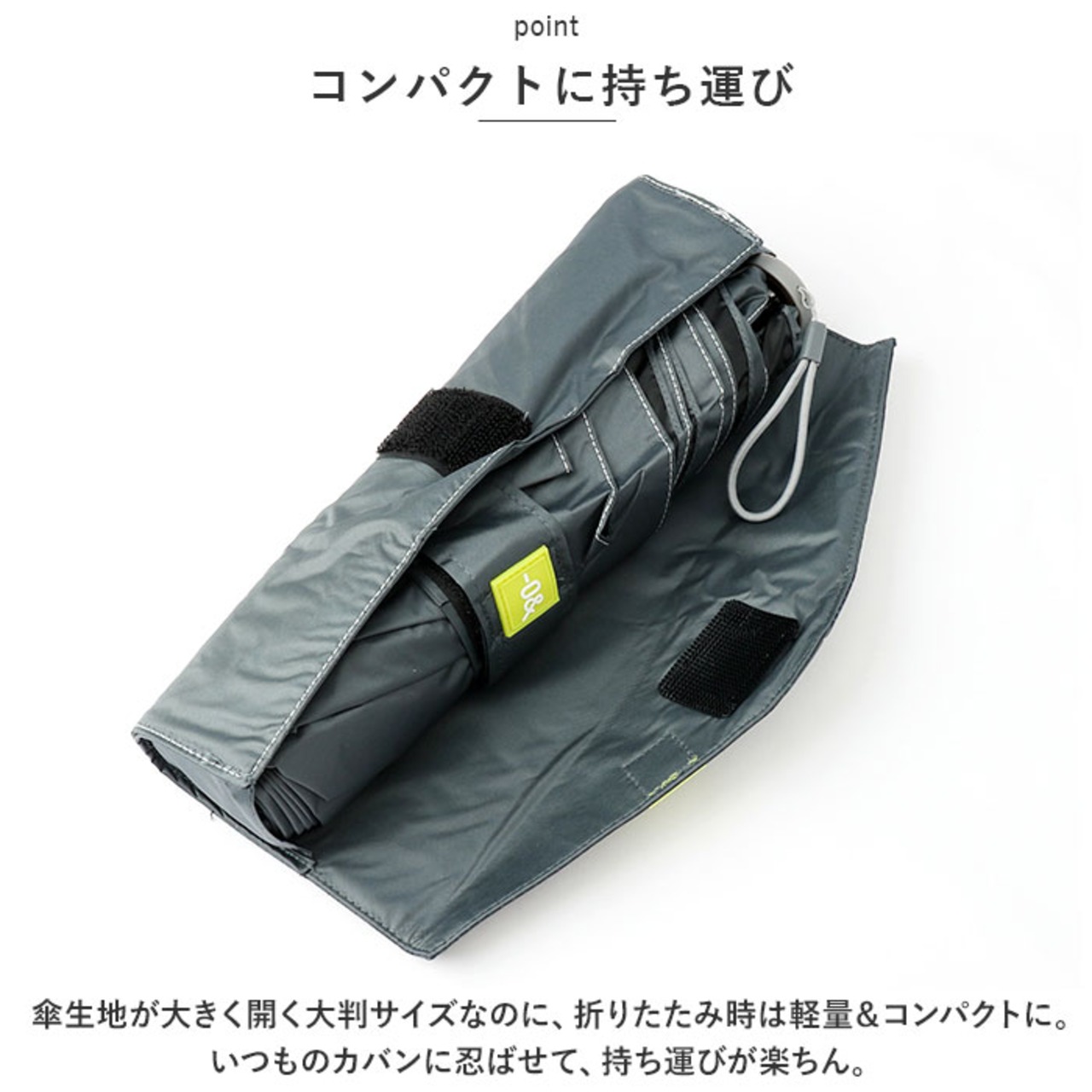 ・傘生地が大きく開く大判サイズなのに、折りたたみ時は軽量&コンパクトに。いつものカバンに忍ばせて、持ち運びが楽ちん。