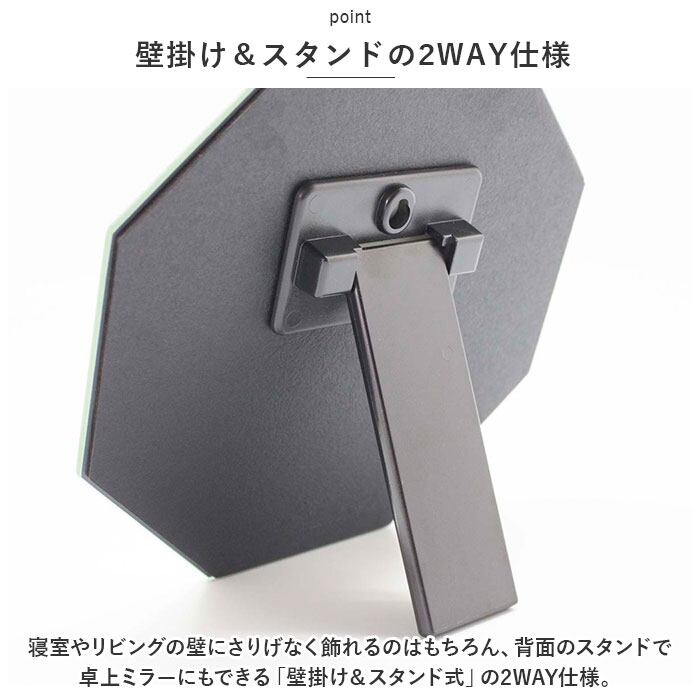 ・寝室やリビングの壁にさりげなく飾れるのはもちろん、背面のスタンドで卓上ミラーにもできる「壁掛け&スタンド式」の2WAY仕様。