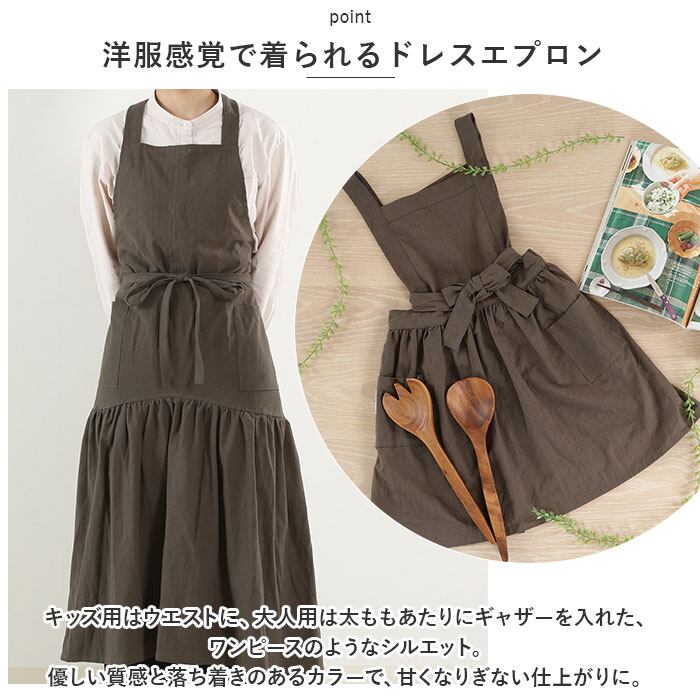 ・キッズ用はウエストに、大人用は太ももあたりにギャザーを入れた、ワンピースのようなシルエット。優しい質感と落ち着きのあるカラーで、甘くなりぎない仕上がりに。