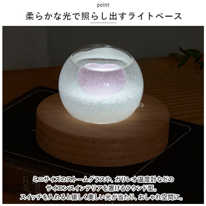 ・ミニサイズのストームグラスや、ガリレオ温度計などのサイエンスインテリアを置けるラウンド型。スイッチを入れると優しく美しい光が当たり、おしゃれ空間に。
