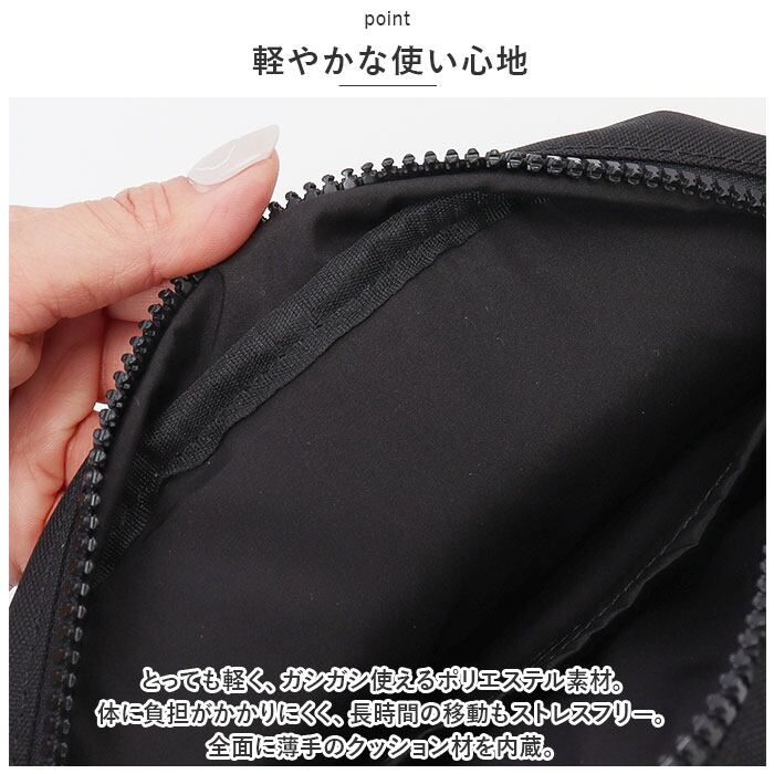 ・開口部は左右どちらからも開く、ダブルファスナー式。中身がこぼれ落ちにくく、プライバシーを確保。