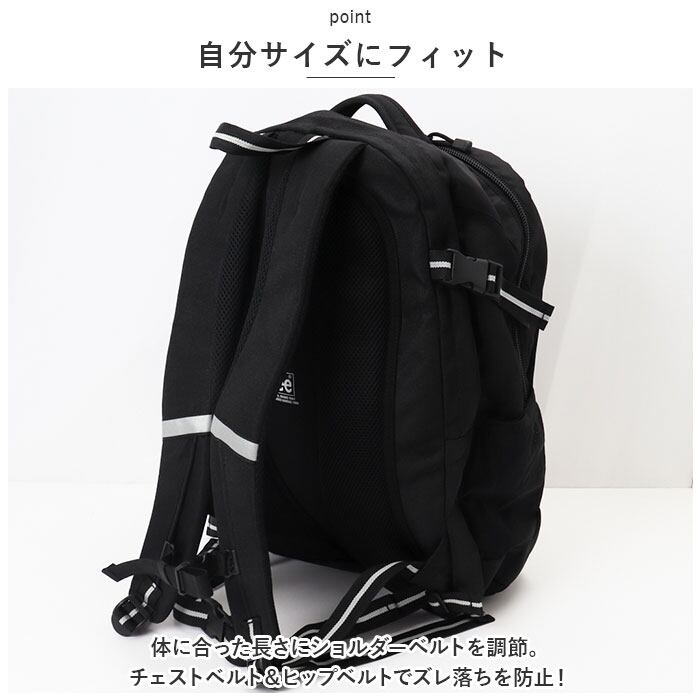 ・体に合った長さにショルダーベルトを調節。チェストベルト&ヒップベルトでズレ落ちを防止!