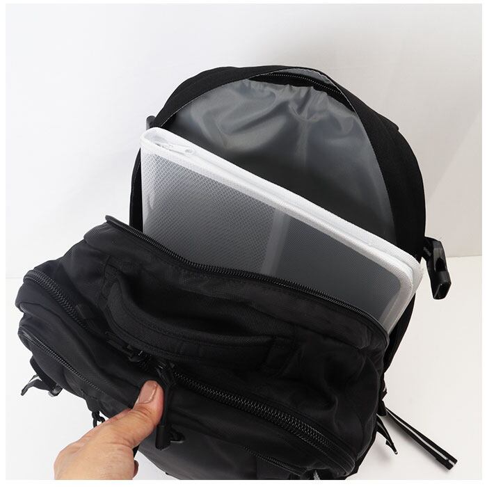 ・前面:ダブルファスナーポケット×1(内側にファスナーポケット×1、オープンポケット×1、メッシュポケット×1、ペンポケット×2、面ファスナー式フラップポケット×1、バックル式Dフック×1)