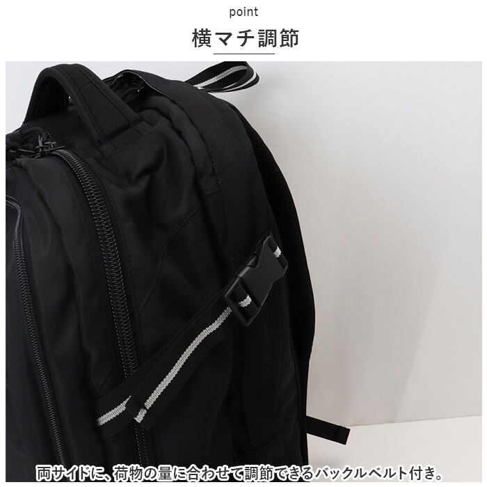 ・両サイドに、荷物の量に合わせて調節できるバックルベルト付き。