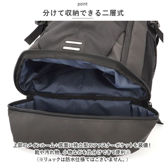 ・上部のメインルーム+底面に独立型のファスナーポケットを装備!靴や汚れ物、小物などを仕分けできて便利◎(※リュックは防水仕様ではございません。)