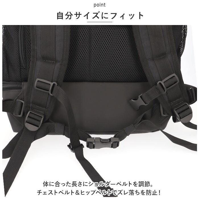 ・体に合った長さにショルダーベルトを調節。チェストベルト&ヒップベルトでズレ落ちを防止!