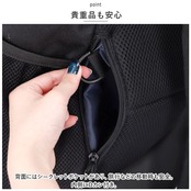 ・背面とショルダーベルトは程よいクッション性があり、体にかかる負担を軽減。汗をかいてもムレにくいメッシュ素材!